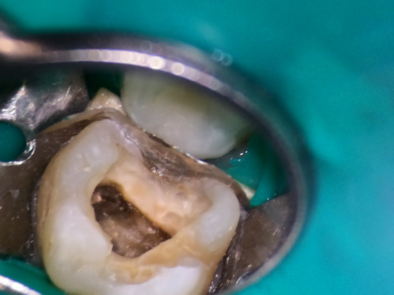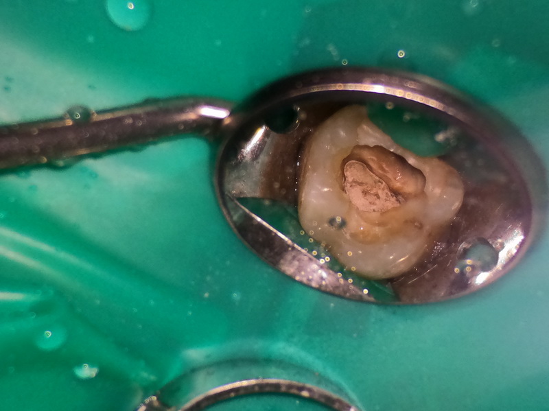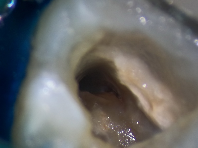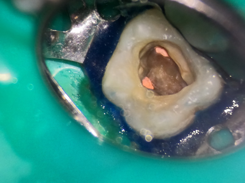Під місцевою анестезією проведено ізоляція зуба, видалення старої пломби з карієсом під нею, відбудова зруйнованої стінки, розпломбування кореневих каналів з використанням операційного мікроскопу, обробка каналів по сучасним протоколам, та пломбування кореневих каналів біокерамічним цементом з відновленням зуба композитним матеріалом.