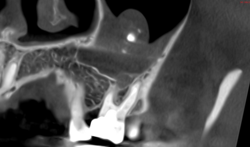 Було прийняте рішення про видалення зуба тільки після обстеження КЛКТ. При огляді знімка була виявлена проблема на верхній щелепі.